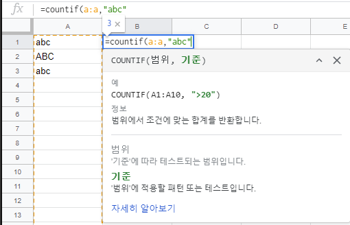 위 이미지를 살펴보면 A열에 'abc'가 2개, 'ABC'가 1개가 있습니다. 소문자 'abc'만 카운트 하고 싶은데 대문자 'ABC'까지 같이 카운트 되는 상황이죠. 이는countif()함수에서는 대소문자를 구분해서 카운트하는 기능이 없기 때문입니다. 당연히 같은 기능을 하면서 조건만 추가된 countifs()문 역시 제대로 대소문자를 구분해서 계산하지 못합니다.