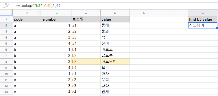 code와 number를 합친 보조열을 만들었습니다. 이 테이블에서 중복된게 없는 가장 유니크한 열이죠. 이제 이 유니크한 열을 통해 vlookup() 함수로 원하는 value를 찾으시면 됩니다. =vlookup("b3", C:D, 2, 0) 이런 식으로 보조열을 찾을 값이 있는 열 앞에 넣어주고 함수를 작성하시면 원하는 값을 조회할 수 있습니다. 필요에 따라 보조열은 숨김처리 하시면 됩니다.