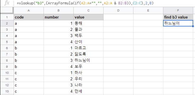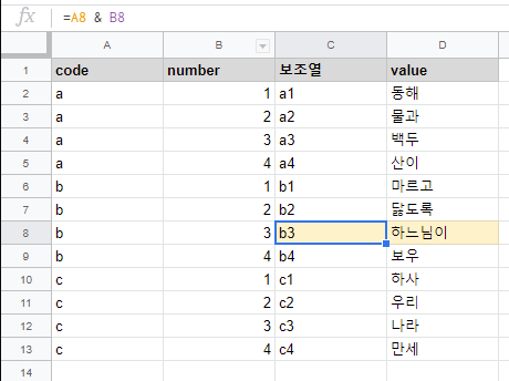 위 예시에서 code가 b고 number가 3인 value를 조회하고자 합니다. vlookup() 함수의 찾을값에 b를 넣자니 b에는 각 number마다 다른 value들이 들어가 있어 원하는 값 검색이 불가능합니다. 이럴 때 함수만 써서는 불가능합니다. 유니크한 값들만 남길 수 있는 보조열을 만들어야 합니다. 중복된 행이 없을 때, 행에 있는 모든 값을 합쳐서 보조열을 만들어줍시다. 이 때, 텍스트를 합쳐줄 때는 열 개수가 그렇게 많지 않다면, 앰퍼샌드(&) 기호로 연결해서 만들어줍시다. concat()함수도 글자를 연결하는데 쓸 수 있는 함수지만, 시트 최적화를 위해선 함수보다는 수식들로 문제를 해결하는게 성능면에서 이득입니다.