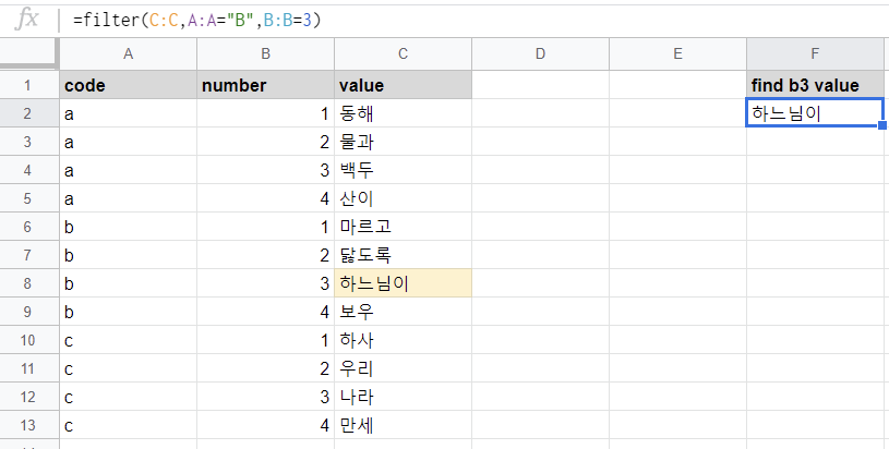 filter 함수는 단일값이 아니라 배열을 리턴하는 함수입니다. 여기선 code "b", number 3인 value가 하나밖에 없었지만, 만약 code와 number가 중복된 value가 더 있다면 그것도 같이 가져올겁니다. 원래 이런 용도지만요... 의도한 단일 값 계산을 위해선 유니크한 행들만 필터 되도록 최대한 많은 조건식을 넣어주는게 좋습니다. 이렇게 유니크 한 값을 최대한 안정적으로 가져온다는 점에선 vlookup()보다 좋다고 할 수 있습니다. vlookup은 조건이 중복된 값이 있을 경우 가장 첫번째 것만 가져오는 한계점이 있기 때문이죠.