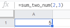 프로그레밍을 모르시는 분들이어도 이 함수가 어떻게 작동할지 예측이 가능할거라 생각됩니다. x1, x2에 입력된 두 값을 더해서 계산해주는 함수이지요. 만든 sum_two_num() 함수를 구글 스프레드시트에서 실행시키면 의도했던 결과가 정확하게 나옵니다.