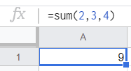 x1, x2, x3에 각각 2, 3, 4를 대입하면 '=sum(2, 3, 4)'와 같은 구글 스프레드시트에서 작동하는 함수를 작성할 수 있습니다. 이 식의 값은 2, 3, 4의 합인 9를 계산해줍니다. 여기서 알 수 있는건 구글 스프레드시트 함수는 다음 형식으로 작성된다는걸 알 수 있니다. '=함수명(인자1, 인자2, 인자3, ...)'