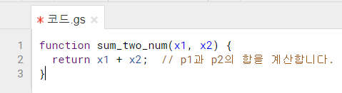 어떻게 9라는 결과가 나온걸까요? 그 과정을 알아보기 위해 sum_two_num()라는 임의의 함수를 만들어보겠습니다. 이 함수는 두개의 숫자가 함수의 변수로 입력되면 합을 계산해줍니다. 구글 스프레드시트 내에서 엑셀의 VBA처럼 매크로를 만들 수 있는 App Script가 있습니다. 여기서 프로그레밍 언어인 Java Script로 다음과 같이 커스텀 함수를 만들 수 있습니다.